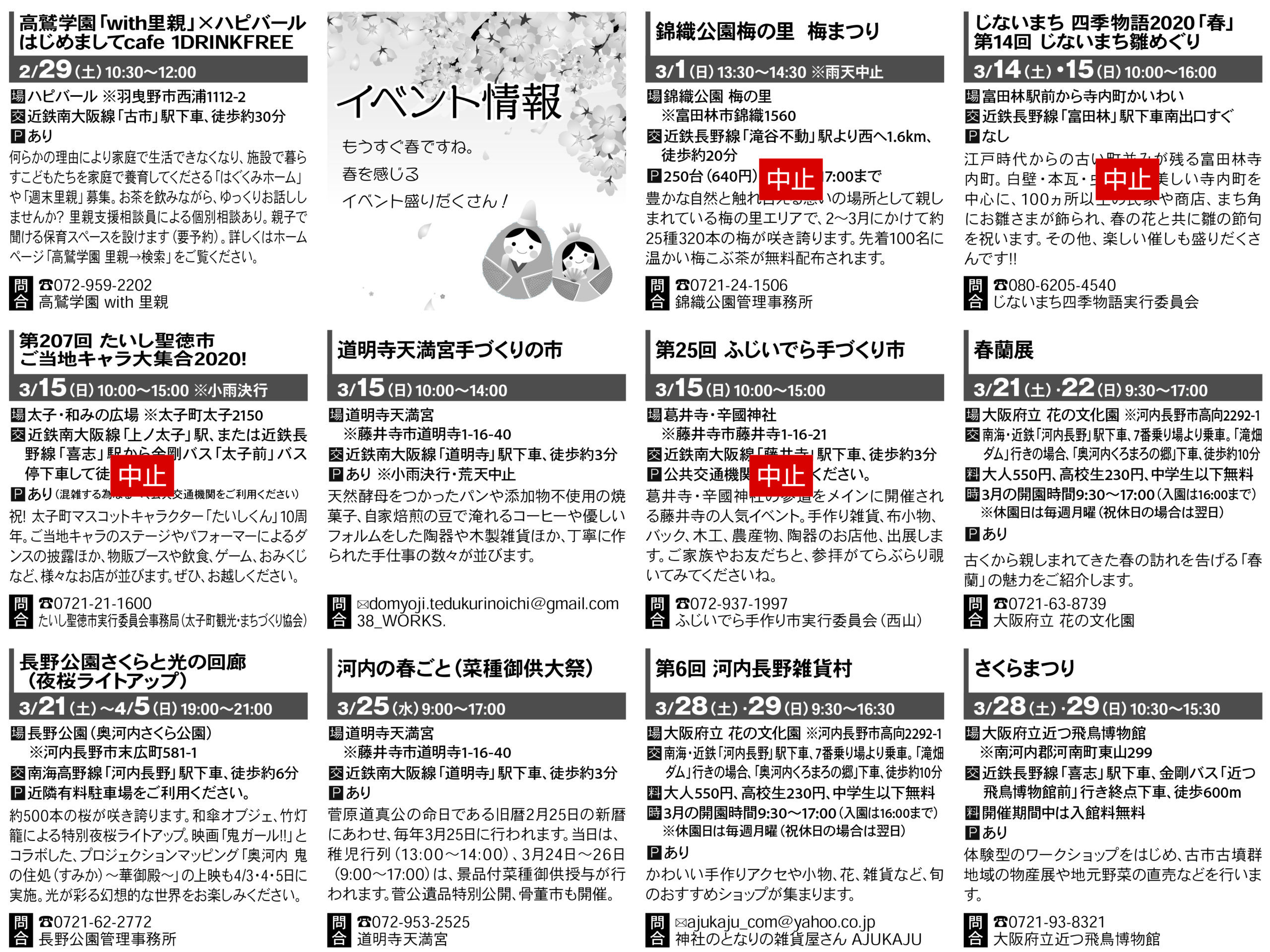 2020/02/23 イベント中止のお知らせ 2月25日(火)折込の3月号のイベント情報中止のお知らせ新型コロナウイルス感染拡大防止のため、下記中止のイベントとなります。 SNSで記事をシェア Facebook Twitter はてブ LINE