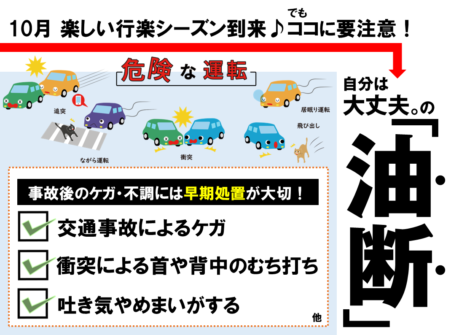 10月に入り、交通事故によるお怪我が非常に増えています。特に首や背中のムチウチの症状が多いです。