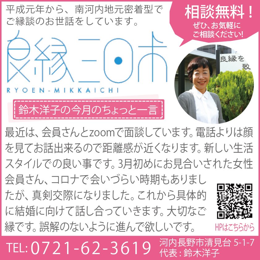 2020/08/02 夏休みにオンライン無料相談会、開催します。 コロナ感染者が増えています。良縁三日市はお盆休み、夏休み期間オンライン相談会を開催します。普段お仕事でお忙しい貴方、お子さんとゆっくり結婚の話しをされたい親御さんオンライン無料相談会、参加されてみては…続きを読む 良縁三日市【河内長野市】 暮らし