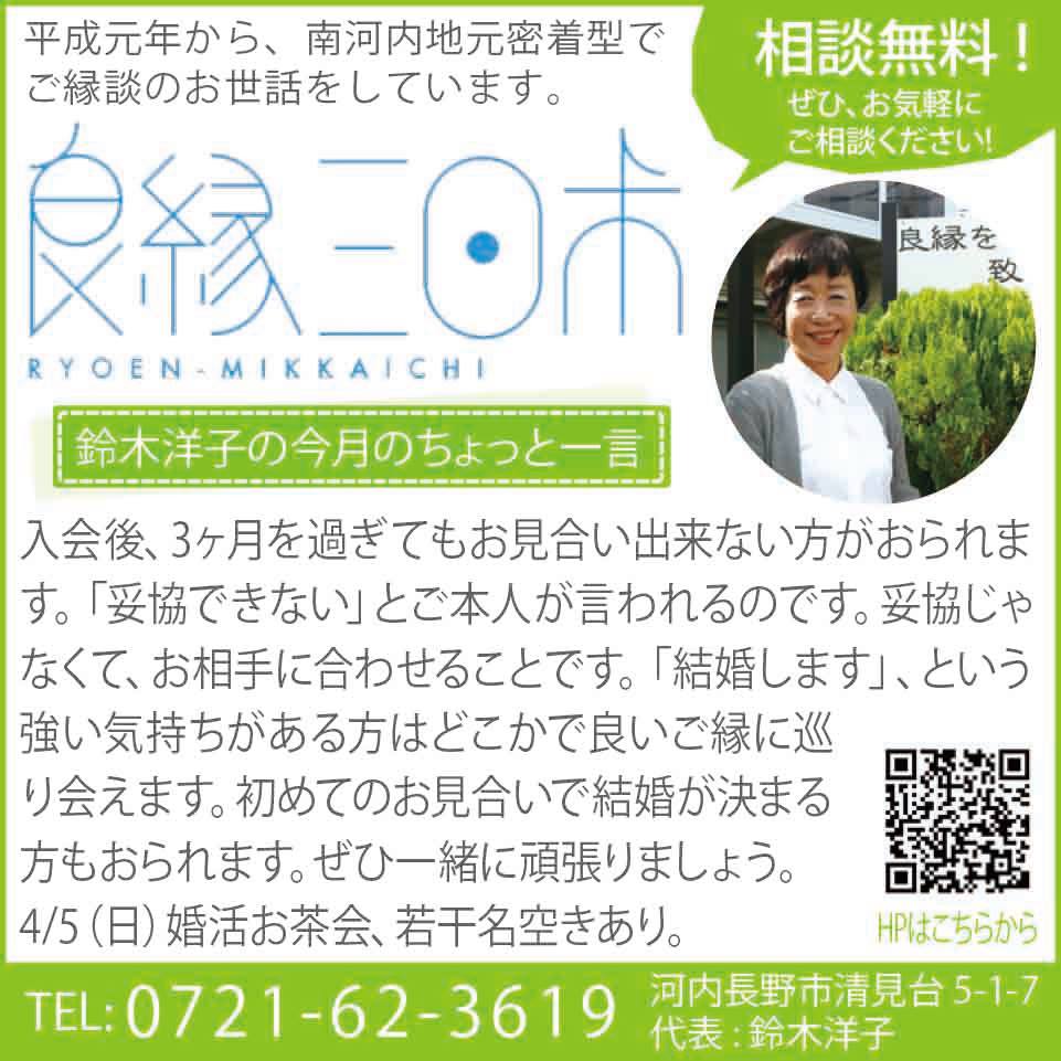 2020/04/04 家族を持とう 桜満開今年は家の近くの桜楽しみます。先日から30歳前後の息子さんのお母さん、娘さんのお母さんが相談に来 られました。結婚する年齢としては、早くはないと思います。ただご本人達は、まだ危機感がなく、その内…続きを読む 良縁三日市【河内長野市】 暮らし