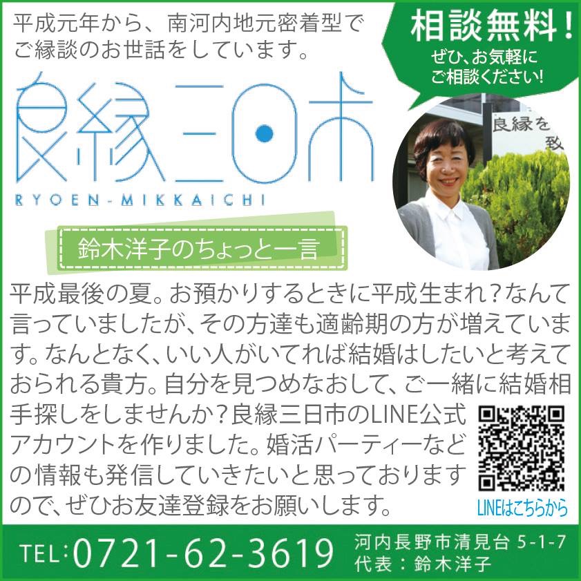 2018/08/17 平成1年から南河内地域に根付いて結婚のお世話をしています。 今日は山の日、祝日です。この週末は良縁三日市はたくさんのお見合いがあります。当日15分前には来て頂いてワンポイントアドバイスをしていきます。お見合いの後のフォローも大切です。皆さん、それぞれ違いますの…続きを読む 良縁三日市【河内長野市】 暮らし
