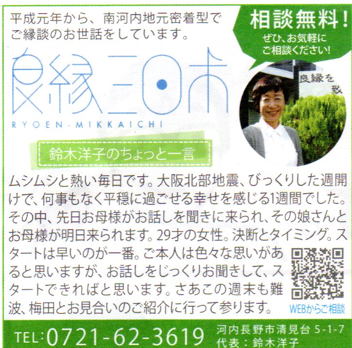 2018/07/28 良縁三日市のLINE公式アカウントを作りました! 良縁三日市のLINE公式アカウントを作りました。婚活パーティーなどの情報も発信していきたいと思っておりますので、ぜひお友達登録をお願いします。 お友達登録はコチラ↓↓↓ 良縁三日市【河内長野市】 暮らし