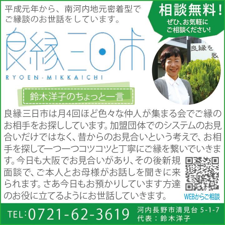 2018/06/30 平成1年から南河内地域に根付いて良縁のお世話をしています。 ムシムシと熱い毎日です。15年ほど前にお世話させて頂きました方から、ご紹介のお電話を頂きました。長い年月が過ぎていますのに、まだ覚えてくださり、ご紹介して頂ける事はコツコツとお世話してきてよかったと、…続きを読む 良縁三日市【河内長野市】 暮らし