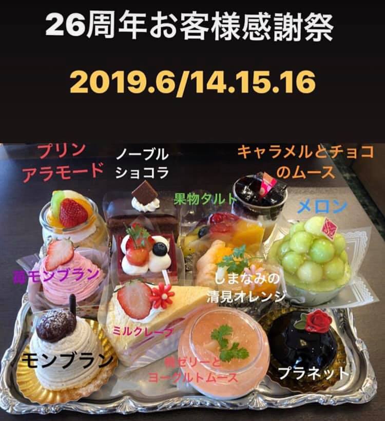 2019/06/13 26周年記念お客様感謝祭 6月14、15、16日 いよいよ明日から3日間ブラン洋菓子店お客様感謝祭をさせていただきます!日頃の感謝を込めまして、お得な3日間になっております😊生ケーキ、焼き菓子をお買い求めいただきましたお客様へ¥1000-毎に¥500…続きを読む 富田林市のケーキ&スイーツ。PATISSERIE BLANC(ブラン洋菓子店)【富田林市】 食べる