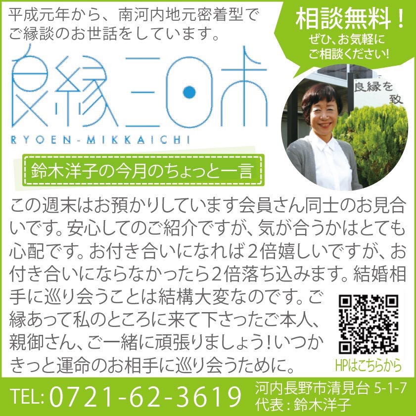 2019/12/14 年末年始完全予約制の婚活相談会開催します。 年末年始完全予約制婚活相談会を開催します。関西出身でお仕事で実家を離れてお住いの方普段お仕事でなかなか時間がない方年末年始実家に帰られて、ゆっくり親子で結婚の事を話し合う機会にされてはと思います。完全…続きを読む 良縁三日市【河内長野市】 暮らし