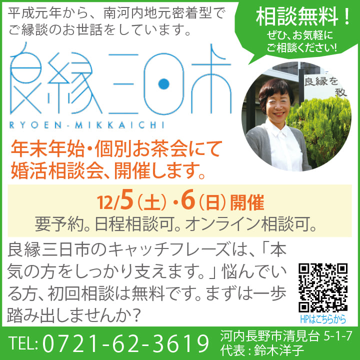 2020/11/20 年末年始個別相談会開催します。12月は5,6日連絡お待ちしています。 結婚条件で関係なかったこと。結婚した方の答え顔のタイプ身長学歴ようは外見より、中身過去の学歴より、今なにしているかという事が大切だと本当にそうです。友達に相談する時は既婚者に相談しなさい。と…続きを読む 良縁三日市【河内長野市】 暮らし