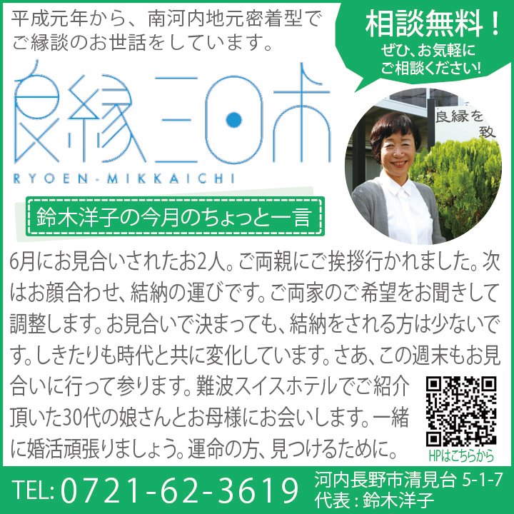 2020/11/06 年末年始個別お茶会にて婚活相談会、開催します。12月は5,6日です。 年末年始。個別お茶会にて婚活相談会、開催します。12月は5、6日お時間は予約させて頂きます。結婚したいご本人、親御さんお話し聞きに来て下さい。オンライン相談でも大丈夫です。まずは連絡お待ちして…続きを読む 良縁三日市【河内長野市】 暮らし