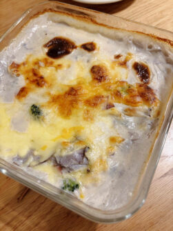 ⑤海老芋に火が通り、とろみが出てきたら耐熱皿に入れて、チーズをかけてトースターで焦げ目をつけたら完成。