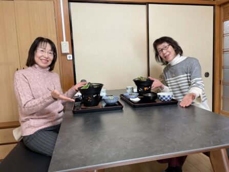メニューはすき焼き、もつ鍋の他、生姜焼きや焼肉定食も選べます。私達は楽しみにしていたすき焼きをお願いしました。運ばれてきたお盆の上には、グツグツと煮えたぎるすき焼きと卵、サラダ、ご飯、香の物が乗っています。甘辛いすき焼きの香りに誘われてサラダを頂くのも忘れ、大ぶりのお肉を溶き卵にからませてパクリ!柔らかい!!脂の部分も甘くて、さすが松阪牛だと感激しました。