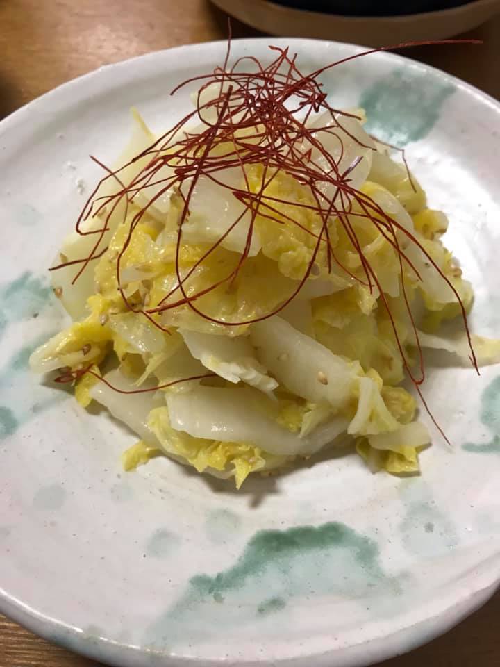 ①白菜は洗って、お湯にくぐらす程度にさっと湯がき、冷まし、太めの千切りにして、水をしっかりと絞ります。