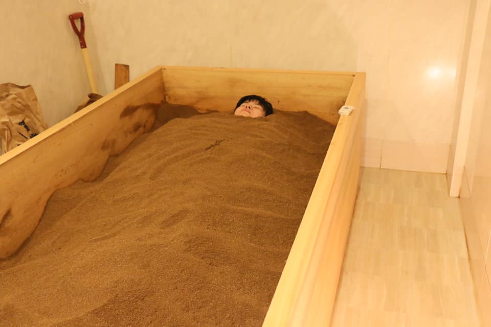 女性だけでも安心な個室には、米ぬかがぎっしりつまった大きなベットがあり、薄暗い中にほんのりライトが差し込む感じで横になります。スタッフの方に米ぬかをかけてもらうのですが、フワッと温かくて軽い米ぬかに包まれます。軽くてもしっかり包まれ、温かくなるので不思議です。汗がジワーッと出てきます。15分の間、途中でスタッフの方が様子を見に来てくれます。リラックスすることが大切なので、一人になります。押せるボタンがあり、スタッフさんはすぐに来てくれるので安心です。一人になると米ぬかの温かさの次に、自分の脈うつドクンドクンという音に気づきます。忙しい毎日で、自分の身体が発する音を意識することがないのでとても不思議で非日常な感覚になります。自分の身体に集中する感じでしょうか。ドクンドクン、ジワーッと汗をかいていると「おかげんどうですか?」とスタッフの方が見に来てくれ、調整をして頂き、足の裏を少しマッサージをしてくれます。そして後半、また一人で時間を楽しみます。