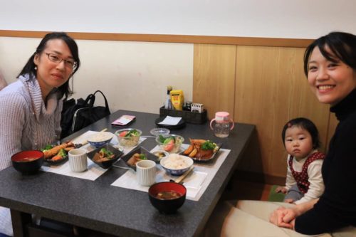 お昼は日替わり定食で、私たちが頂いたたのはハンバーグとエビフライ定食でした。ぶり大根もついていて、お魚もお肉も両方食べられるなんて贅沢でした。ごはんはおかわり無料で、子どももいたため大盛りにしてもらいました。料理はどれも味がしっかりしていて、ハンバーグについていた付け合わせの人参までもがグラッセになっていて、美味しかったです。最後に、デザートのフルーツも出して頂きました。イチゴとキュウイとリンゴに練乳がかかっていて、美味しかったです。
