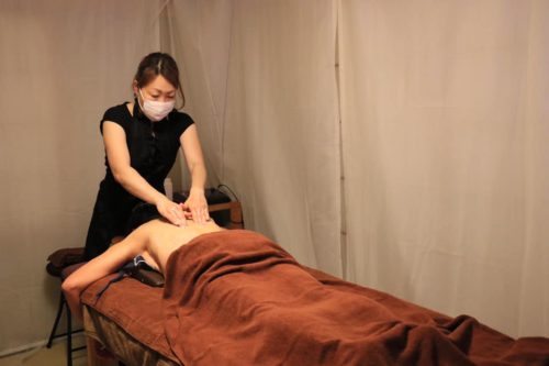 次にベッドの上に俯せになり、上半身にクリームをのばし、両手でゆっくりマッサージです。あら不思議、セラピストの方の手から電波が流れてくるのです。まるで魔法にかかっているように心地良いビリビリが指から流れてきて、天に昇ったような気持ち良さです。これがゴッドハンドというものでしょう!!