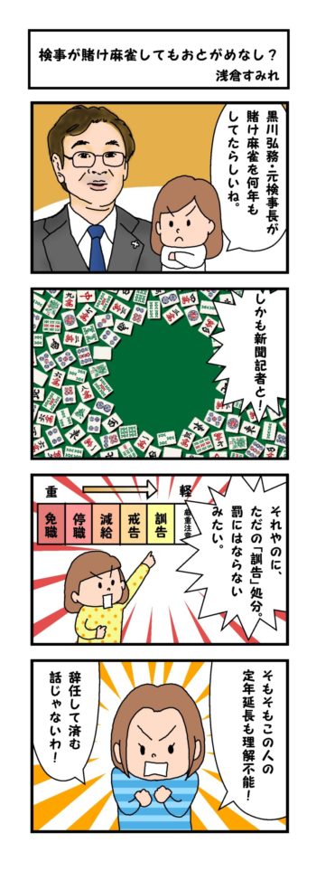 権力に都合のいい人間を法解釈をねじ曲げてまで無理やり定年延長させたことにも腹立つけど、賭け麻雀が発覚したことで辞任して済む話じゃないわ!