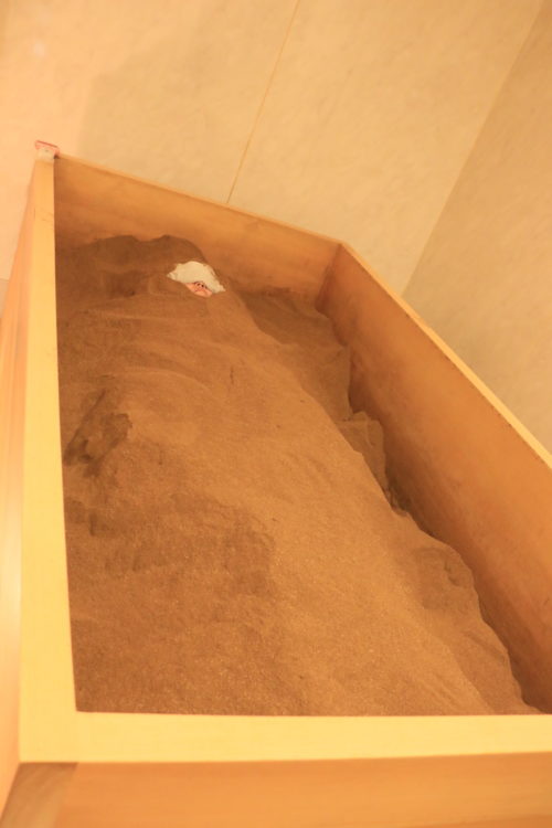 いよいよ酵素風呂!!服を脱いでいる間に私が入る穴を掘ってもらい、いざ入酵。まるで真夏のサラサラの砂浜を歩いてるかの様。あ、熱い。慣れてきたところで寝転がり、スタッフさんに埋めてもらいます。熱さで我慢出来ないところはタオルを巻いたりして熱さを抑えてもらえます。ここから15分、途中で様子を見にスタッフさんが来ます。しばしリラックス〜。そして、初めての私には少し長く感じた15分が終わり、酵素風呂から出てみると、身体の芯からポカポカ。クーラーで冷えていた身体が喜んでるし、シャワーで米ぬかを落とすとお肌ツヤツヤ!いいこと尽くし!!